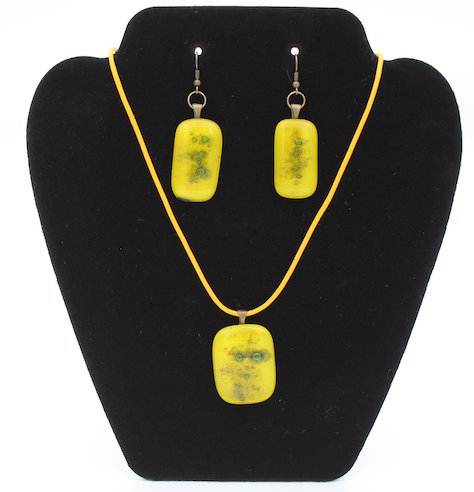 Deze juwelen worden gevormd door het versmelten van glasfragmenten. Door toevoeging van andere stoffen ontstaan onverwachte details.